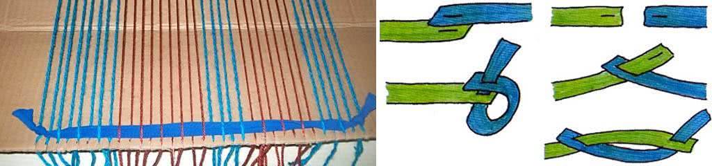 Подобным способом можно ткать и коврики из остатков пряжи или лоскутные из лент/жгутов (помните – джинса, колготки, тряпье?) Те и другие материалы возможно использовать совместно, но основа и уток должны быть однородными. Набираются они из отдельных нитей/лент, закрепляемых узелками, слева на рис. Остается решить, как соединять нити/ленты, длины которых не хватает, или чтобы вывести узор. Что до нитей, то на картонном «станке» – никак, нужно брать цельные. А 2 способа соединения лент показаны там же в центре и справа. Первым можно соединять ленточки совсем короткие, но стык будет виден. Второй стык невидим, но напуск концов нужен от 4-5 см.