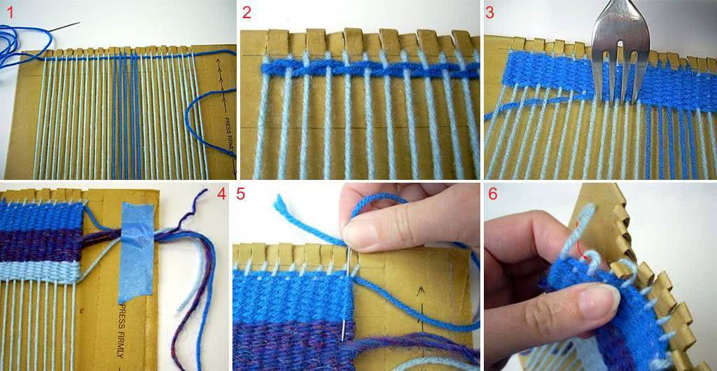 Для изготовления небольшого, прим. до 40 см длиной, тканого коврика из ниток, пряжи или матерчатых лент/жгутов на первых порах и кросны не нужны. Достаточно будет прямоугольного куска картона и столовой вилки. Вилкой сразу же накалывают отверстия для основы: вдоль коротких краев картонного «станка» чертят, на расстоянии 3-5 см от него, линии. Вилкой прокалывают по линии первые 4 дырочки, затем вилку смещают на 3 зубца, чтобы крайний попал в уже проколотую последнюю дырочку, протыкают еще 3 отверстия и т.д. Картон прорезают до отверстий; нить основы проводят цельную, перекладывая петлей под краевыми лепестками-«колками». Свободными оставляют концы основы прим. по 10 см.