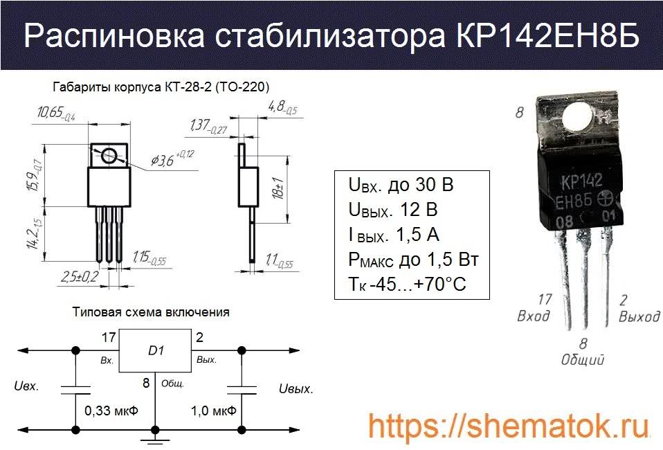 КР142ЕН8Б является одним из линейных стабилизаторов указанной серии. Его типовая схема подключения очень простая и подходит для всех КР142ЕН. Она включает в себя саму КРЕНку (еще одно неофициальное название 142ЕН8Б) и пару сглаживающих конденсаторов. В даташит рекомендовано применение небольших ёмкостей с величиной 0,33 и 1,0 мкФ. Обычно используют керамические или танталовые версии.