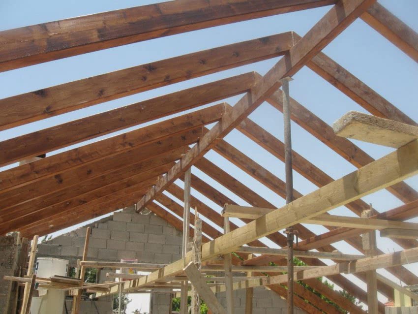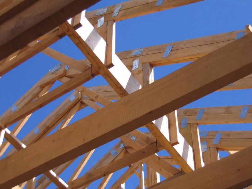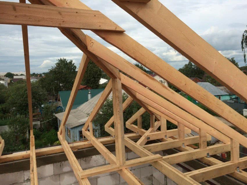 Крепление стропил к стене необходимо для того, чтобы кровля не срывалась при штормовых ветрах. Для деревянных домов каркас собирают с помощью скоб. Систему усиливают с учетом планировки, используя подкосы и стойки. На завершающем этапе устанавливают финальное покрытие