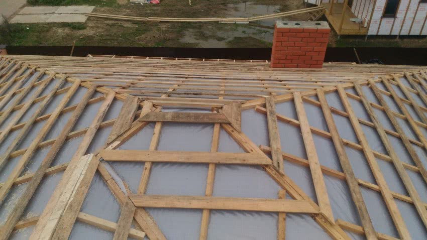 На стропила крепится гидроизоляционная мембрана. Сверху выполняется контробрешетка, а потом обустраивается обрешетка. На нее укладывается кровельный материал.