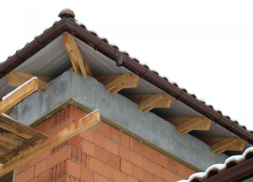 Обустраивается каркас фронтона, обшивается доской дюймовкой. Потом целиком монтируется карниз. Торцы перекрытия закрываются лобовой доской, а снизу крепятся 2 пояса досок. Следует установить держатели для водостока.