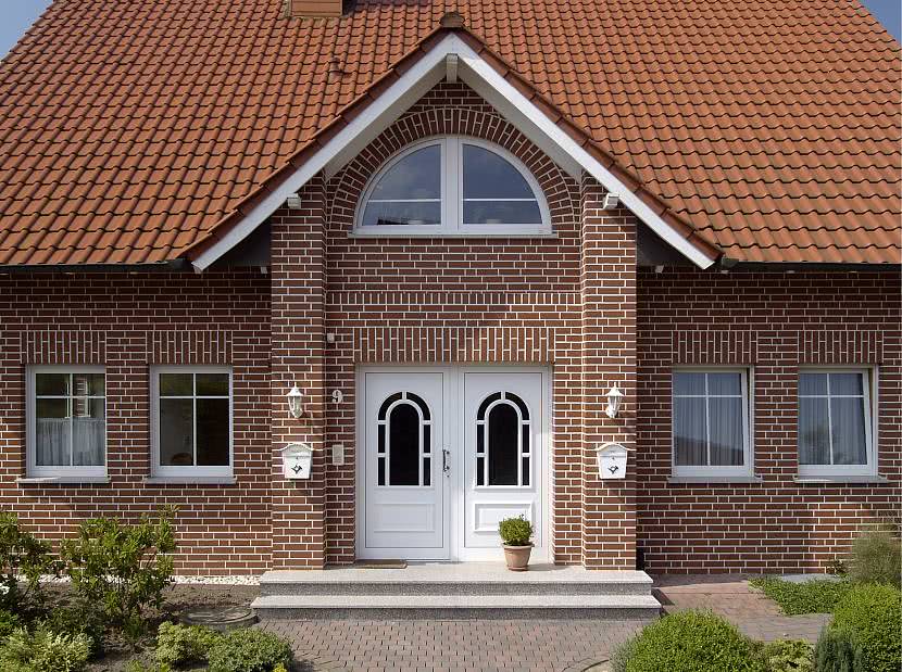 Если строительство дома выполняют из кирпича, то еще на этапе строительства переднюю стенку дома продумывают заранее. Кирпичи выкладывают интересным способом: зигзагообразно, оставляя интересный орнамент. С помощью узора выделяют оконные проемы и цоколь. Над дверными и оконными рамами кирпичи кладут в невысокие ряды вертикальными способом. Если дверь имеет полукруглую конструкцию, то кирпичи поверх нее выкладывают в форме арки.