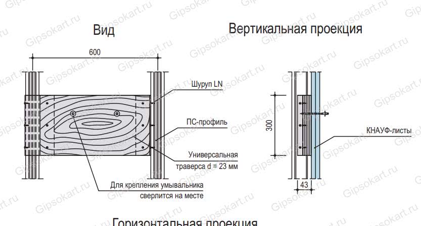 Суть технологии я описывал в статье установка раковины на гипсокартон. На этапе монтажа каркаса для перегородки, между стойками устанавливается фирменная деревянная траверса или просто монтируются доски. После обшивки листами, закладные элементы не видны и при необходимости их используют, как платформы для навеса.