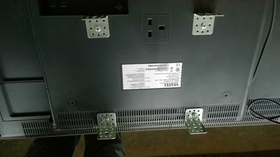 - Винтами зафиксируйте анкерные пластины на задней панели телевизора. Их можно подрезать болгаркой, если не подходят по размеру.