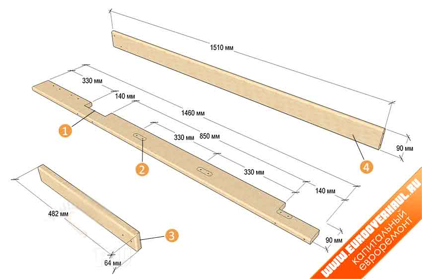1 — вырезы 38 мм; 2 — места крепления ступенек; 3 — ступени лестницы, 3 шт.; 4 — ограждение.