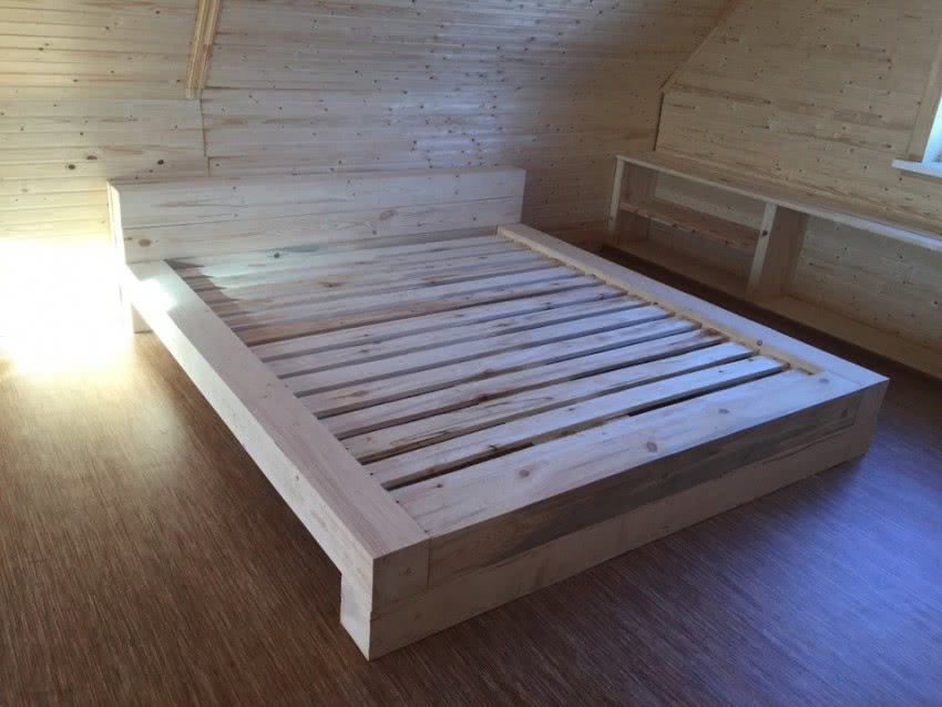 На самом деле самостоятельно изготовить кровать из бруса не составляет большого труда, если имеются элементарные навыки обращения с инструментом. По стандартной схеме собирается прямоугольный каркас кровати из прочного бруса по размеру матраса.