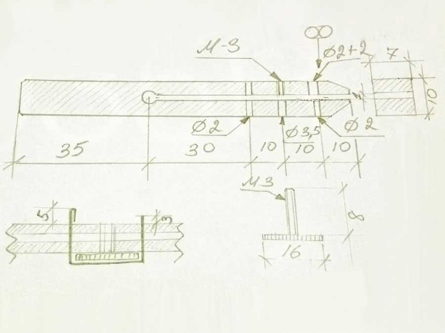 Два из них должны по диаметру быть немного толще будущей проволочной скобы. Третье будет использоваться для установки винта, зажимающего крючок.