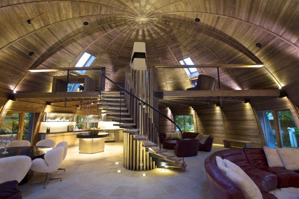 Интересным и практичным является внутреннее обустройство круглого дома. Проект может показаться снаружи не слишком привлекательным, но внутри он потрясающий, а также очень практичный и бюджетный. Если вы цените большое пространство, полукруглые комнаты и вместительную гостиную, то круглый дом-сфера — ваш идеальный выбор.