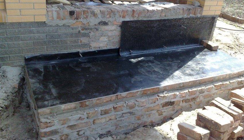 - Улаживаем основание кирпичом. Обязательно продумать гидроизоляцию, так как при воздействии влаги, кирпич быстро разрушается. Основу конструкции покрываем двойным рубероидов. Ни в коем случае не экономим на данном этапе.