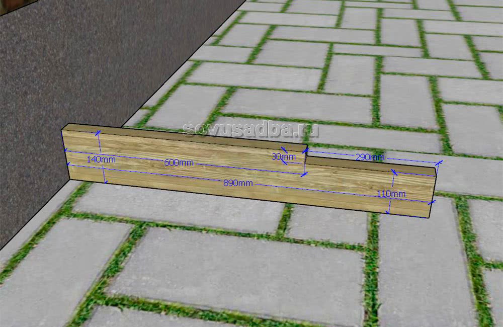 Начинаем работу с одной досочки длиной в 890 мм и шириной 140 мм. При этом ее толщина может быть как 40, так и 50 мм. Ваша задача вырезать у торца выборку на толщину ступени и на ширину проступи.