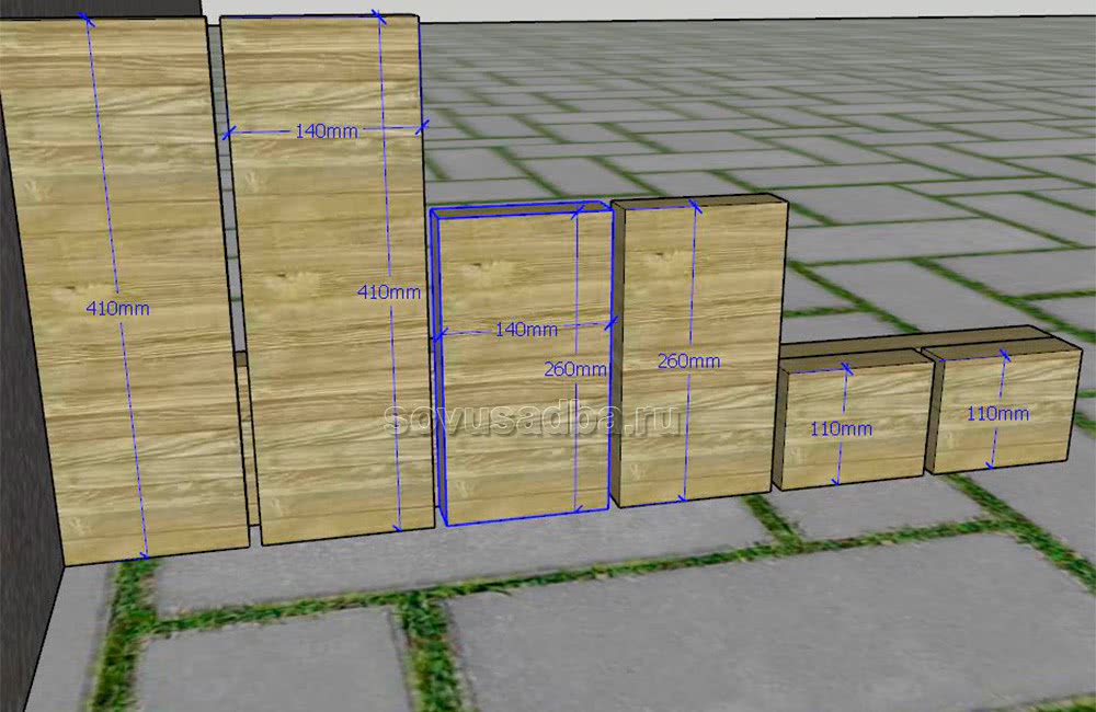 Теперь прибьем к заготовке еще 6 реек той же ширины, но высотой в 410 мм, 260 мм, 110 мм. Между пиломатериалом соблюдаем сантиметровый зазор.