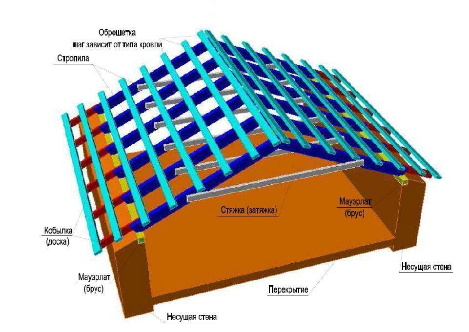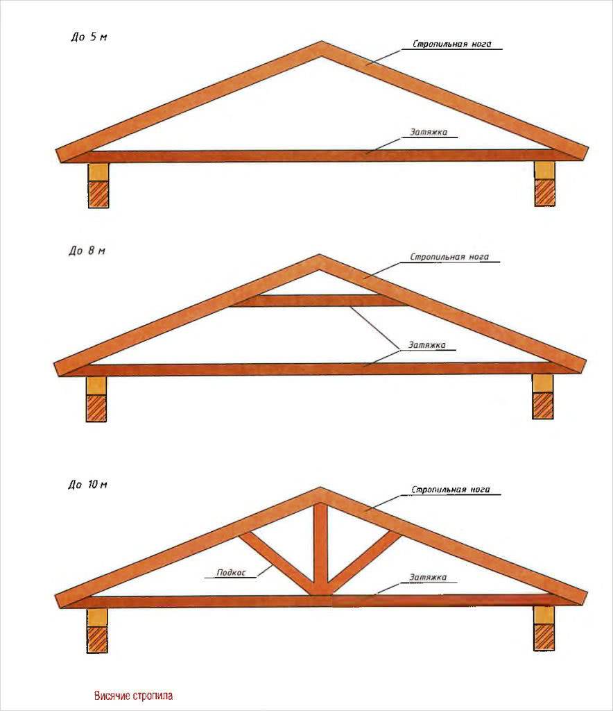 Чем шире пролет строения, тем больше возникающие в конструкциях напряжения, сложнее устройство каркаса. До 6 м достаточно затяжек, совмещающих функции балок перекрытия. Свыше — вводится дополнительные ригели.В домах без внутренней несущей стены, превышающих ширину 9 м, систему крыши укрепляют бабками и подкосами. Фрагмент из двух стропил, затяжки и связей называется фермой.