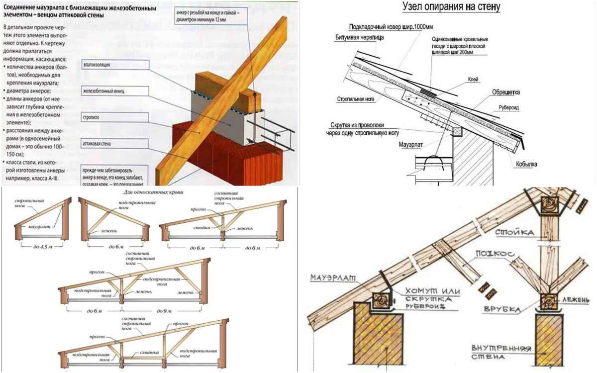 По проекту одна из стен должна быть меньше другой, чтобы обеспечивать уклон крыши в 20-30 градусов. Укладка мауэрлата. На поверхность стены, которая должна быть заранее гидроизолирована рубероидом, укладывается мауэрлат. Брус мауэрлат служит не только креплением для стропил, но и отлично распределяет нагрузку с кровли. Для крепления мауэрлата используют специальные анкера или металлическую арматуру.