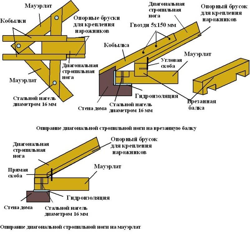В деревянных зданиях функцию мауэрлата выполняет верхний венец или обвязка. Стропила нижним концом врубают в несущую балку, дополнительно закрепляют скобами и скрутками из проволоки.Чтобы в коньке не возникали распирающие напряжения и стропила не смещались вдоль ската, сопряжение выполняют внахлест или встык, закрепляют накладками, болтами, нагелями.