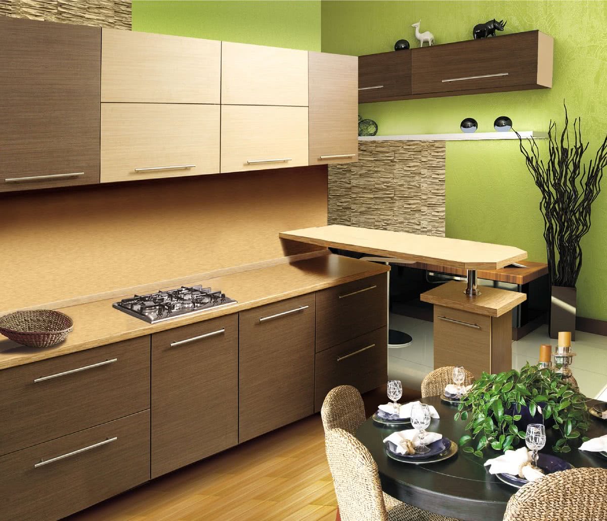 Защита и декор. Не забывайте о внешнем покрытии – во влажном и теплом микроклимате кухни дерево без него быстро потеряет первоначальный вид и лоск. Самый простой вариант – обработка лаком или восково-масляными пропитками, которые помогут сохранить красоту древесной структуры. Но можно подобрать и любой оттенок краски, оклеить пленкой или купить готовые материалы (ЛДСП или постформинг) с уже нанесенной фабричной защитой.