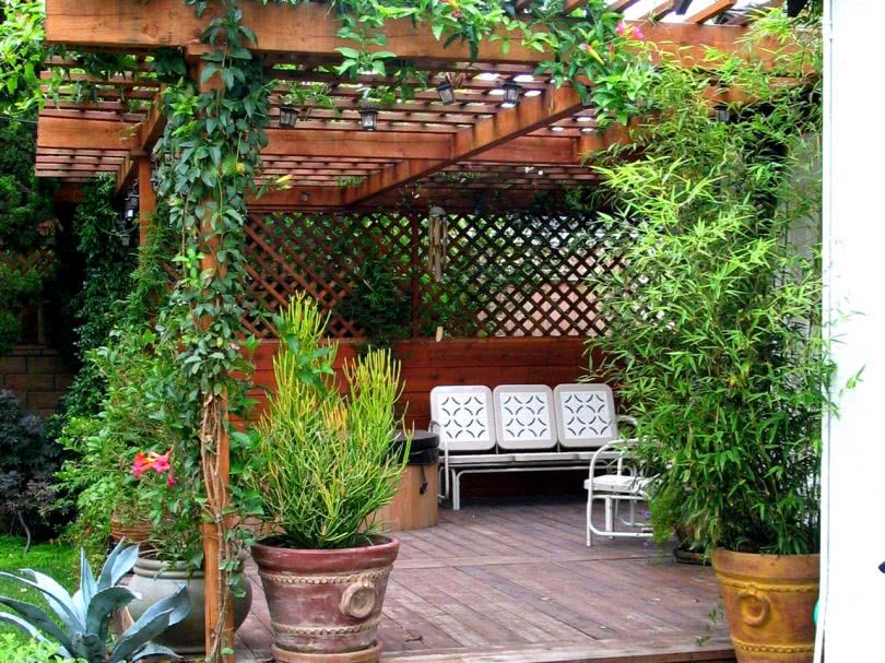 - перголы (открытые беседки), увитые вьющимися растениями;