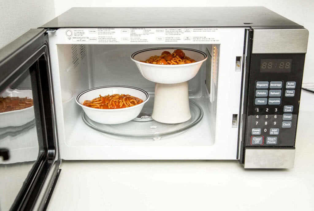 Чтобы подогреть две тарелки в микроволновке одновременно можно воспользоваться обычным стаканом. Сделав тем самым второй ярус.