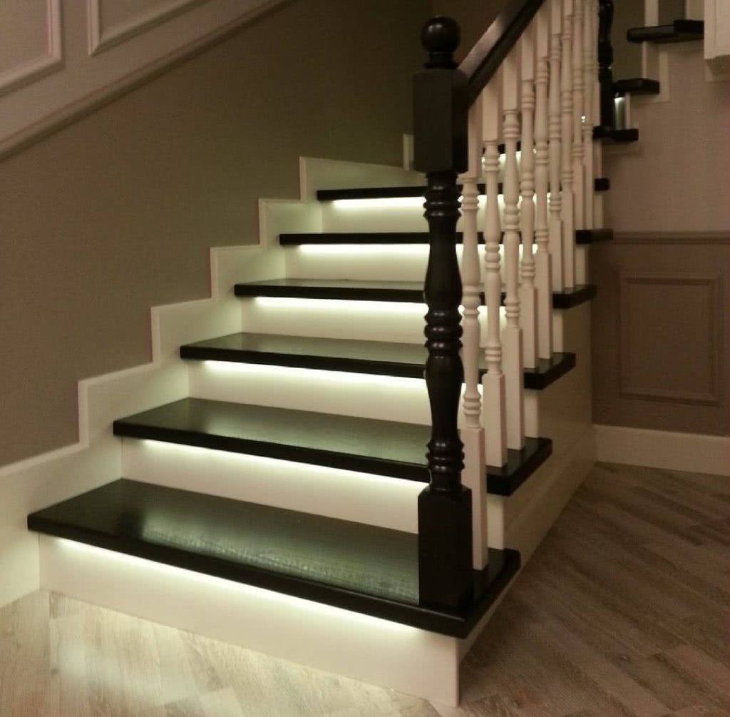 Освещение лестницы. С помощью светодиодной ленты можно сделать автоматическую подсветку лестницы. Особенно это будет удобно в темное время суток, чтобы не включать основной свет в холле.