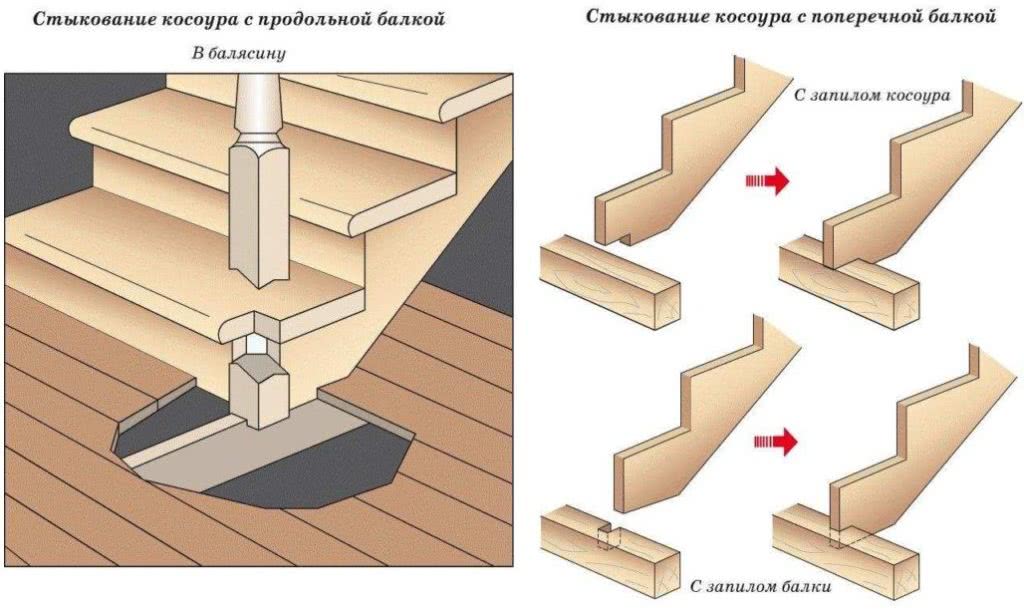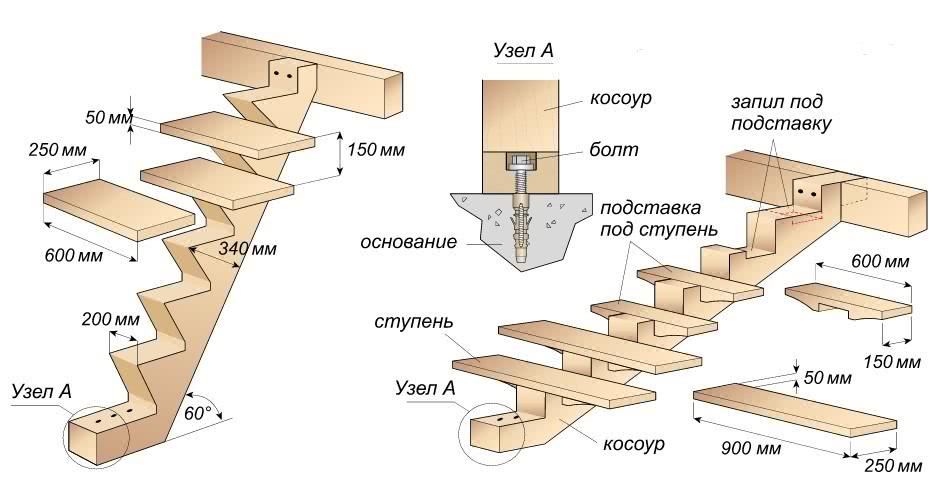 Конструкция с использованием треугольных кобылок является более надежной. Кобылки крепятся с использованием шкантов, для которых предварительно делаются пазы. Наиболее прочная конструкция получается с использованием кобылок сложной формы, при этом на косоурах делается специальный вырез. Соединение элементов лестницы осуществляется при помощи клея и саморезов.