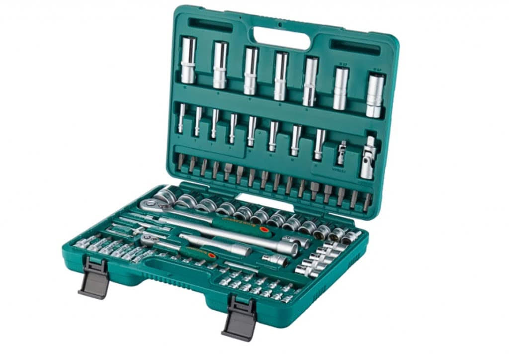 Здесь первое место мы отдали набору от «Джоннесвэй». В комплекте находится 94 инструмента. Минимальный размер головки начинается от 4 мм. Всего здесь их 13 штук с максимумом в 14 мм. Для вращения оснастки есть трещотка с храповым механизмом на 48 зубцов. Карданный шарнир упрощает работу с болтами, вкрученными в неудобном месте. Второй комплект торцевых головок представлен в размерах 10-32 мм. Но конце присоединительного выступа воротка находятся подпружиненные шарики, обеспечивающие прочную посадку оснастки. Владельцам набора нравится в отзывах то, что у коробки полноценные петли (со штифтами), а не просто согнутый пластик, который со временем отламывается.