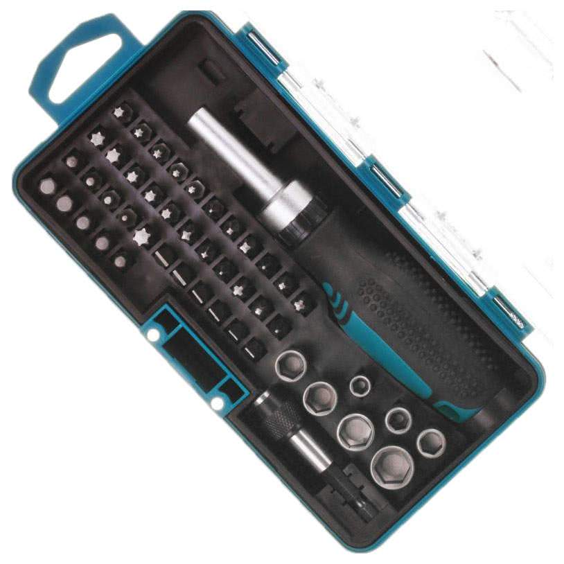 Это универсальный набор оснастки для шуруповертов, содержащий биты со шлицами SL, PH, H, PZ, TX. Элементы выполнены из высокопрочной стали. На битах есть специальная торсионная зона, защищающая девайсы от поломки при возрастании нагрузки. Все насадки имеют одностороннее исполнение. В комплект входит отвертка с мощной рукояткой, которую удобно держать руками. После продолжительной работы на коже не появляются водянки. Высокий упор на ручке не позволит соскочить руке мастера при надавливании. 7 торцевых головок с размером 5-11 мм помогут разобрать бытовую технику или небольшой агрегат в автомобиле (насос, фильтр и т. д.). Всего в подборке присутствует 47 элементов.