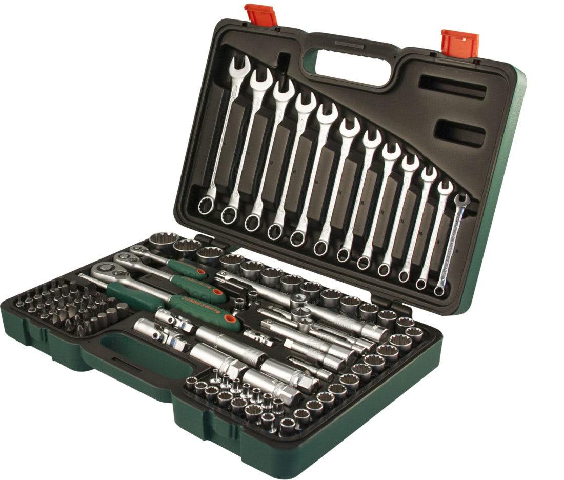 Открывает тройку лучших набор инструментов Jonnesway S04H624101S. Исходя из многочисленных отзывов пользователей, этот комплект является универсальным средством для починки личного авто, вне зависимости от того, какова сложность и интенсивность нагрузки производимых работ. Набор включает в себя 101 предмет: отвёртки, биты, плоскогубцы, огромное количество торцевых головок, воротки, трещотки, удлинители, а также совмещённые гаечные ключи. Единственной претензией к производителям может стать проблема с кейсом: при ошибочном открытии донной крышки вместо верхней весь инструмент попросту выпадет из своих лотков. Но подобное встречается практически во всех наборах.