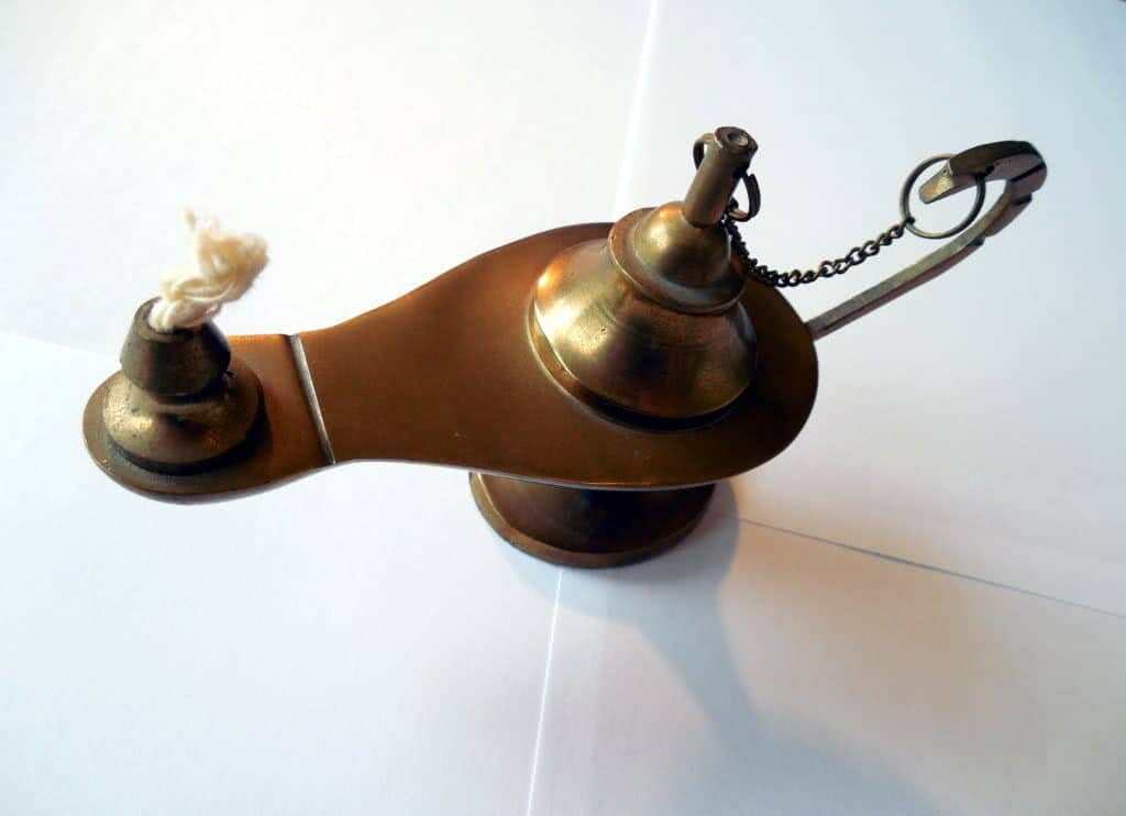 Изначально, источником света в осветительных приборах служило растительное масло, жир или сырая нефть, которые наливались в овальные чаши, прикрепляемые к потолку или потолочным балкам. Из растительной сырья, изготавливался фитиль, который погружался в сжигаемое вещество и в процессе его горения излучался искусственный свет.