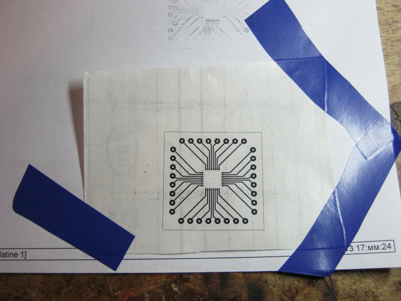 Теперь трафарет должен быть очень плотно приклеен к поверхности печатной платы. Также не помешает визуальный осмотр — если где-то какую-то область пропустили или же она пристала плохо, то берем утюг и пробуем исправить этот недочет.