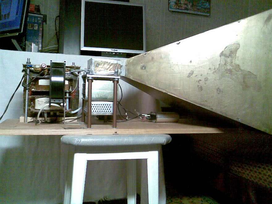Магнетрон достал из микроволновой печки с мощностью — 700 ватт. Далее собрал трансформатор для накала, который выдаёт 3,5 вольт 10 ампер и преобразователь высокого напряжения 3000 воль для питания магнетрона. Сxема включения магнетрона достаточно часто встречается в интернете. Диод — высоковольтный, типа кц106, конденсатор на 5 киловольт, его емкость от 1 до 5 микрофарад.