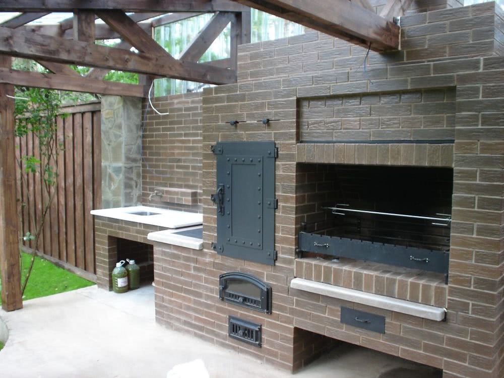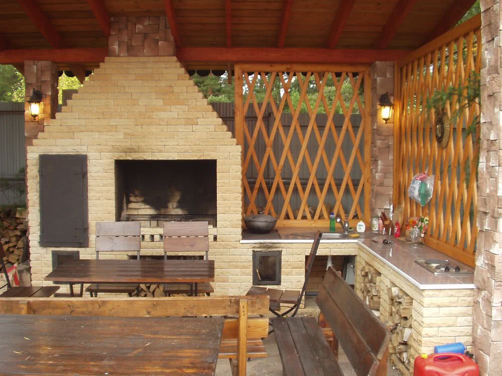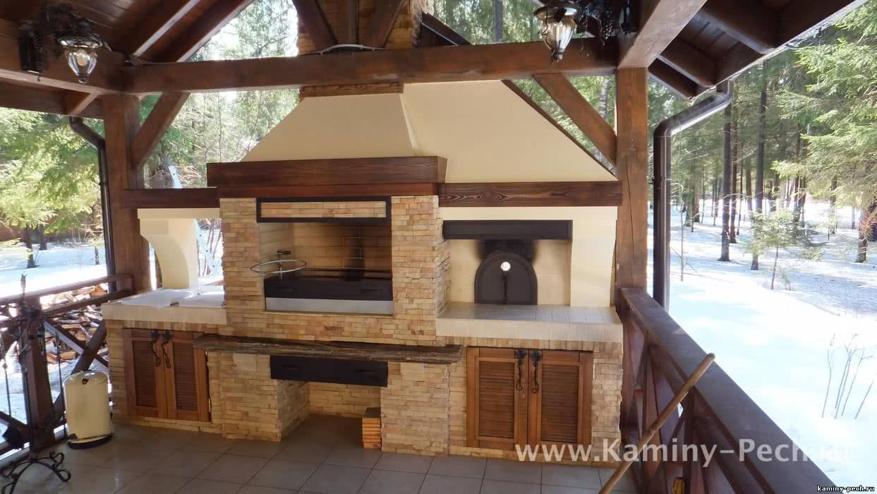 Наиболее распространенный и дорогой вариант для дачной беседки. В конечном счёте получается большая система для приготовления пищи в разных форматах: