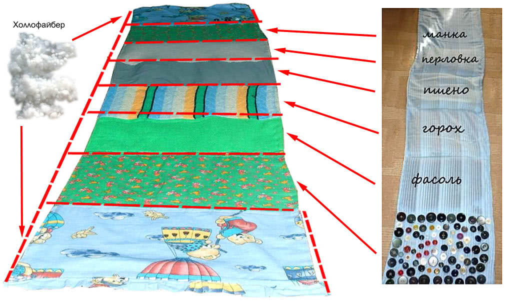 Набивной коврик – это изделие, выполненное в виде кармана из ткани, куда насыпают различные природные материалы – горох, крупы, муку и прочее. Таких карманов может быть несколько.