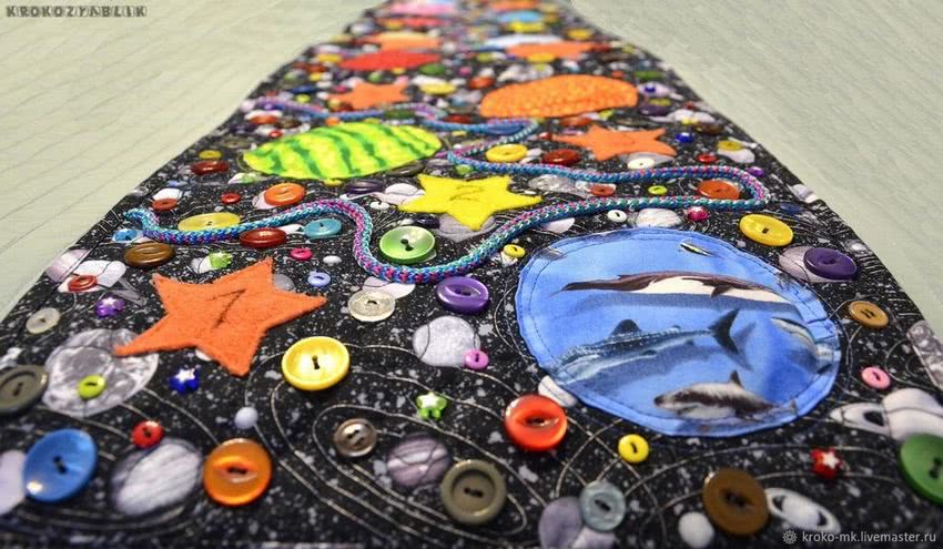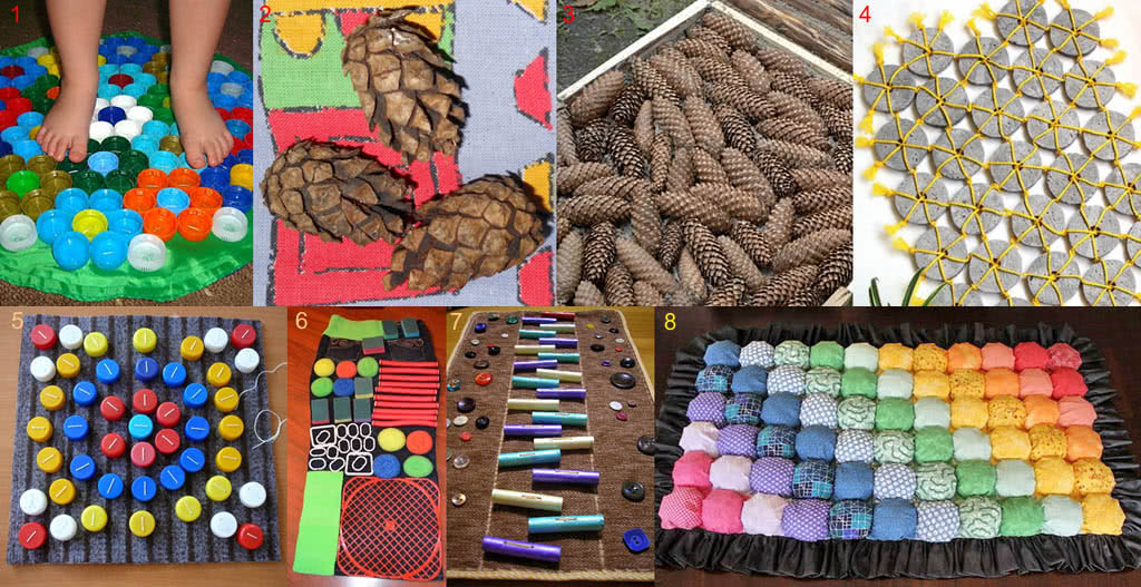 Чтобы привлечь внимание ребенка к полезному для здоровья занятию, обеспечьте ему увлекательную игру. Сшейте такое изделие, которое позволит не только ходить по нему ногами и получать приятные тактильные ощущения, но и даст возможность играть с его элементами. Используйте такие идеи: