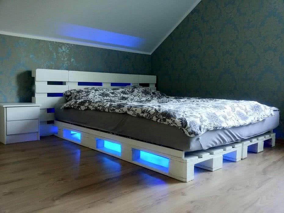 В простейшей форме кровать из европоддонов напоминает подиум, на который устанавливается матрас. Наличие изголовья, короба и подсветки значительно усложняет процесс сборки мебели.