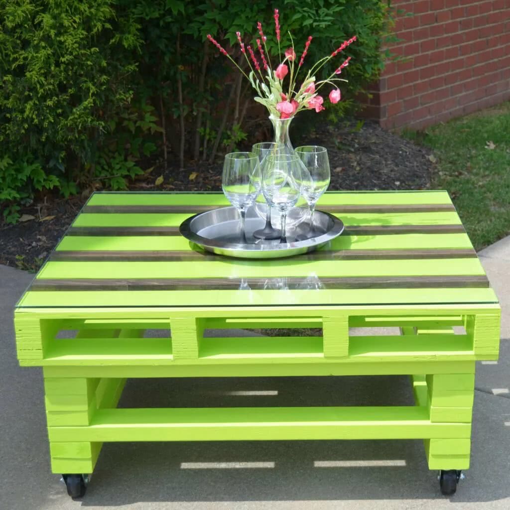 Столы из поддонов можно использовать очень декоративно, особенно при конструировании ножек со столешницей (можно сделать на колесиках). Благороднее стол смотрится с верхней стеклянной пластиной. Фантазия в ярких тонах. Поддон с колесиками или низкими ножками внизу получается журнальный столик в деревенском стиле.