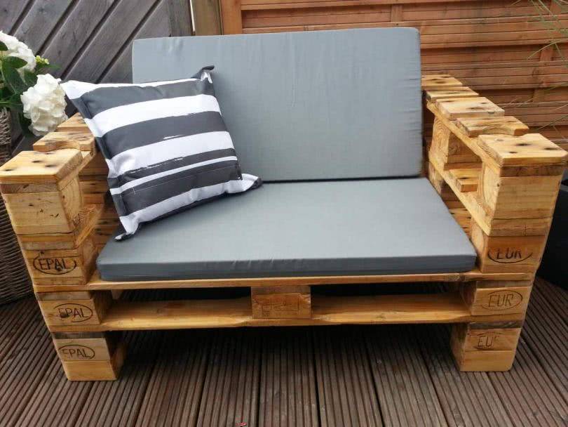 Довольно часто на фотографиях интерьеров можно увидеть диваны или скамьи из паллетов. Такой диван может быть снабжен мягким сидением и спинкой. Можно сделать подлокотники.