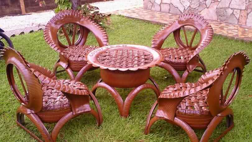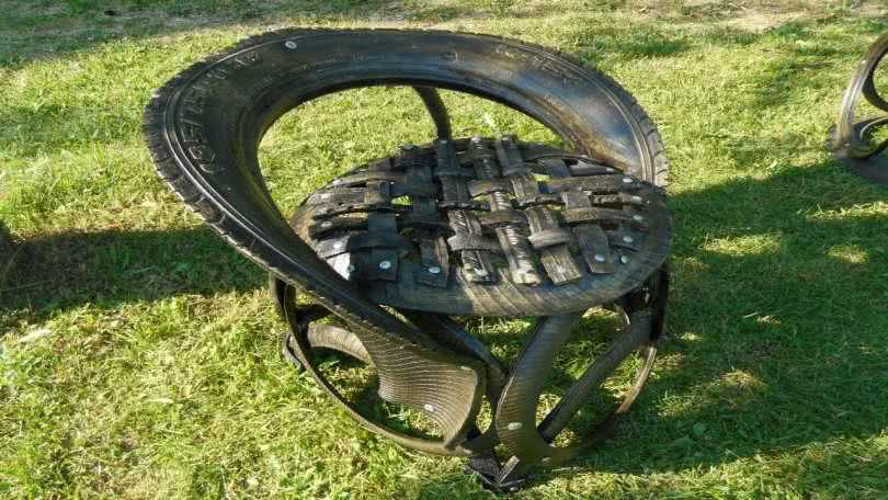 Отработавшая свой ресурс резина хорошо поддается обработке, режется и обладает хорошей пластичности, требуя усиленной фиксации, готовые кресла из старых шин обладают высокими показателями износостойкости и прекрасно смотрятся в саду или у дома, на открытой террасе.