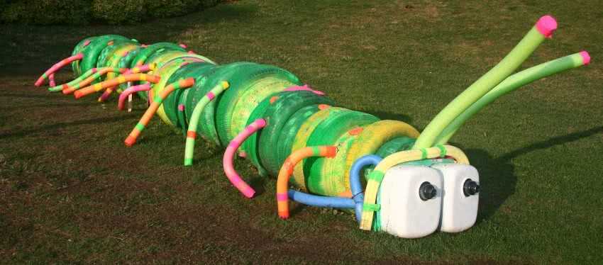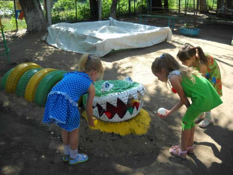 Самоделки из старых автомобильных шин можно использовать также и на различных детских площадках. Имеется большое количество идей, которые можно воплотить для того, чтобы придать дворовой территории красивый вид. При помощи старых автомобильных шин можно превратить детскую площадку в сказочный городок, где детям будет очень интересно играть и проводить свой досуг. Изготовить можно мини-песочницу, крылатые качели, сказочных зверей или мультипликационных персонажей.