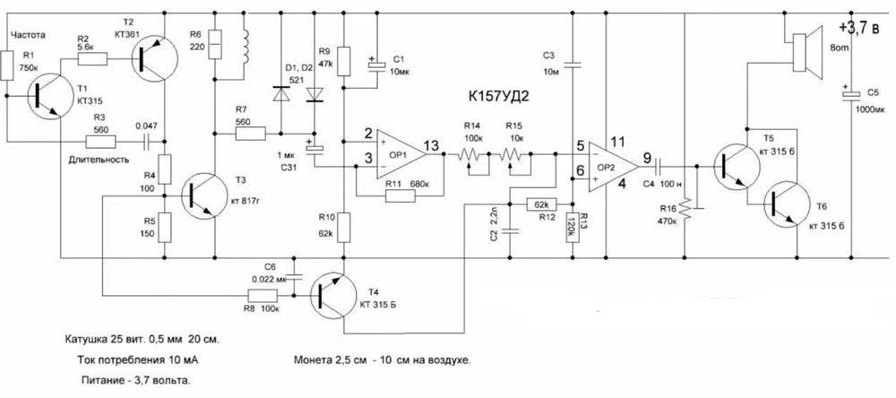 Первый транзистор создает задающий генератор, второй – поисковый генератор. Если к катушке приблизить металл, в наушниках появляется звук. Подробная схема приведена ниже.