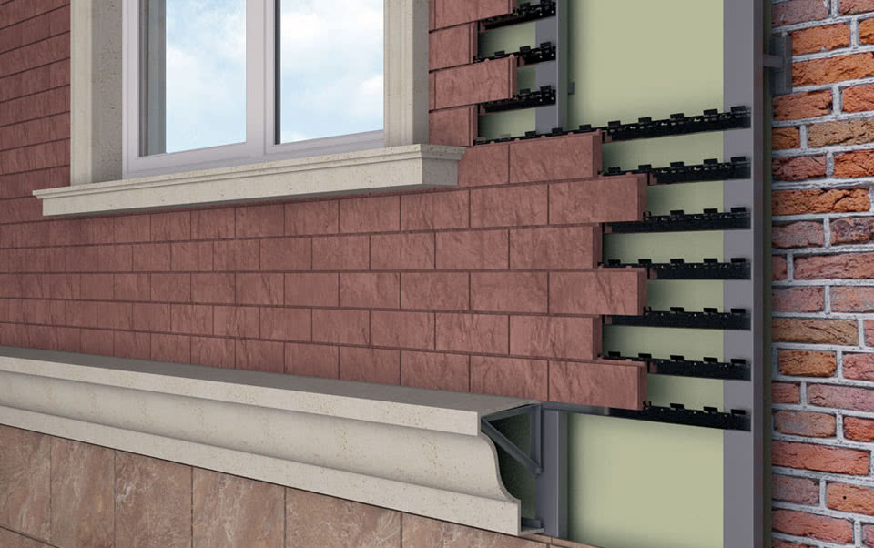 Сегодня есть и такая плитка, которая монтируется на подсистему, что даёт избежать мокрых процессов при отделке, а так же при необходимости выполнить утепление.Это может быть керамическая плитка, либо плитка, изготавливаемая по технологиям искусственного камня. Как правило, продаётся в комплекте с элементами каркаса и крепежом. |