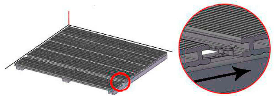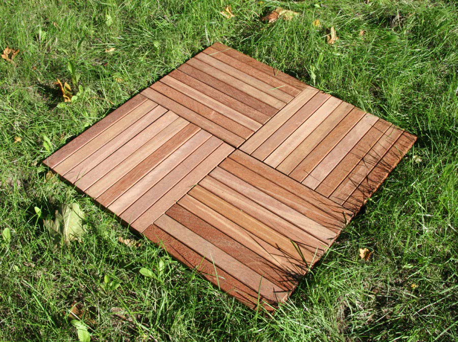 Садовая паркетная доска представляет собой квадратную плитку, состоящую из двух слоев: пластиковая или деревянная подложка, каркас и планки ДПК ламели. Пластиковая подложка оснащена специальными замками, которые позволяют с легкостью выполнить монтаж изделия.