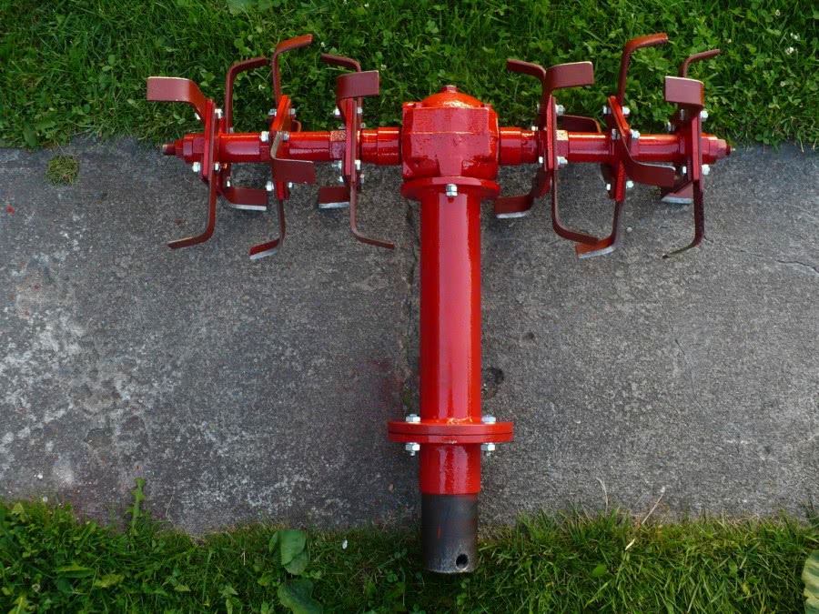 В первом варианте задействовано два редуктора. Первый помогает механизму двигаться с заданной скоростью, а второй выполняет вращение роторной насадки для обработки почвы. При наличии ведущих колес культиватор дополнительно оборудуют ножами-плоскорезами.