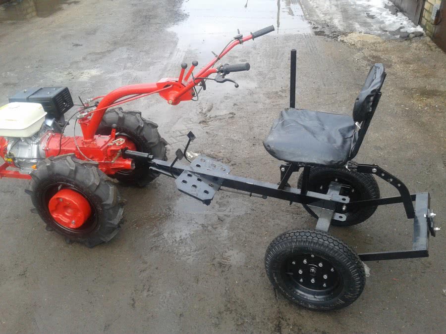 Заводские агрегаты часто компонуются двухколесной тележкой с сиденьем для водителя. Не составит особого труда приставки для мотоблоков собрать своими руками. Одна из них – тележка-прицеп.