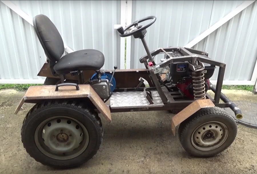 Из уголка сваривается рама необходимого размера, к которой крепится двигатель с системой подачи топлива и бензобаком. Передача крутящего момента от редуктора, понижающего скорость, на колеса, осуществляется через цепь. При этом можно использовать мост от мототехники-донора, установленный на колесную ось. Все органы управления переносятся на руль агрегата. При конструировании более тяжелой техники используется типовой двигатель ЗИД-5 или другие его модификации, которые ранее широко применялись на различных агрегатах. В связку с ним устанавливается коробка передач от «Запорожца» и облегченный ведущий мост.