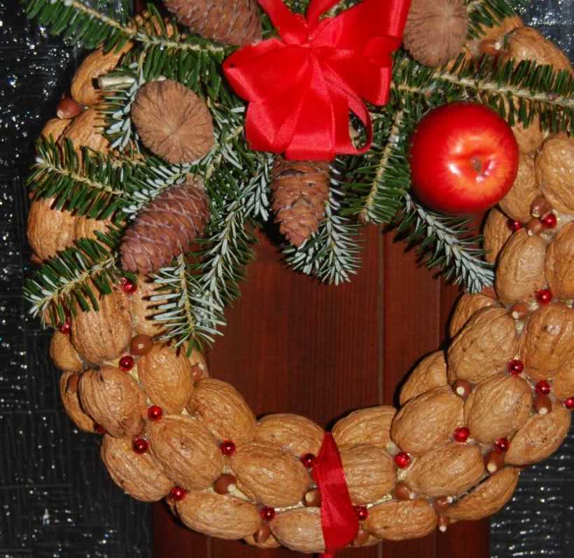 Из арахиса или фундука несложно изготовить рождественский миниатюрный венок, собрав орешки на шнур или проволоку. Декорировать изделие можно лентой, тесьмой или кружевом.