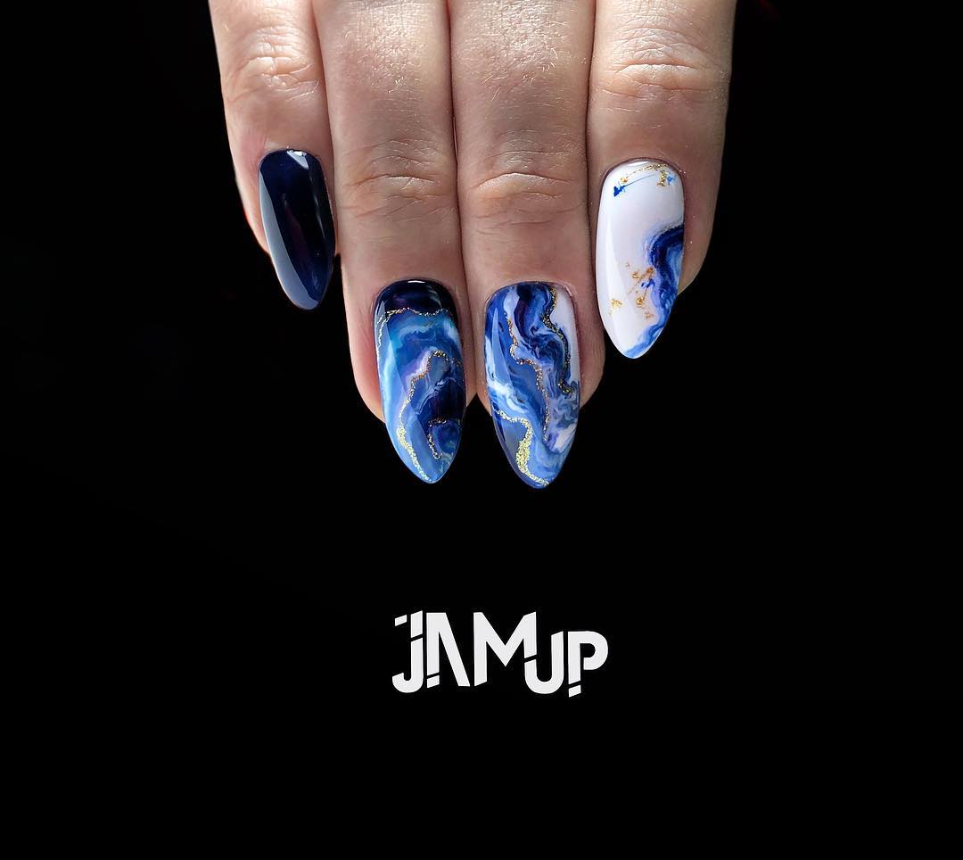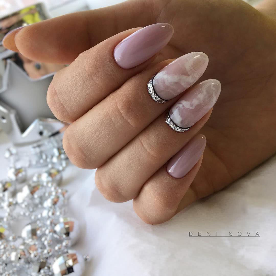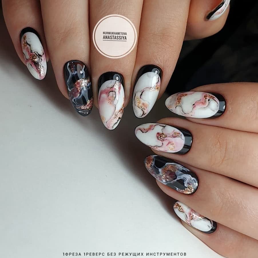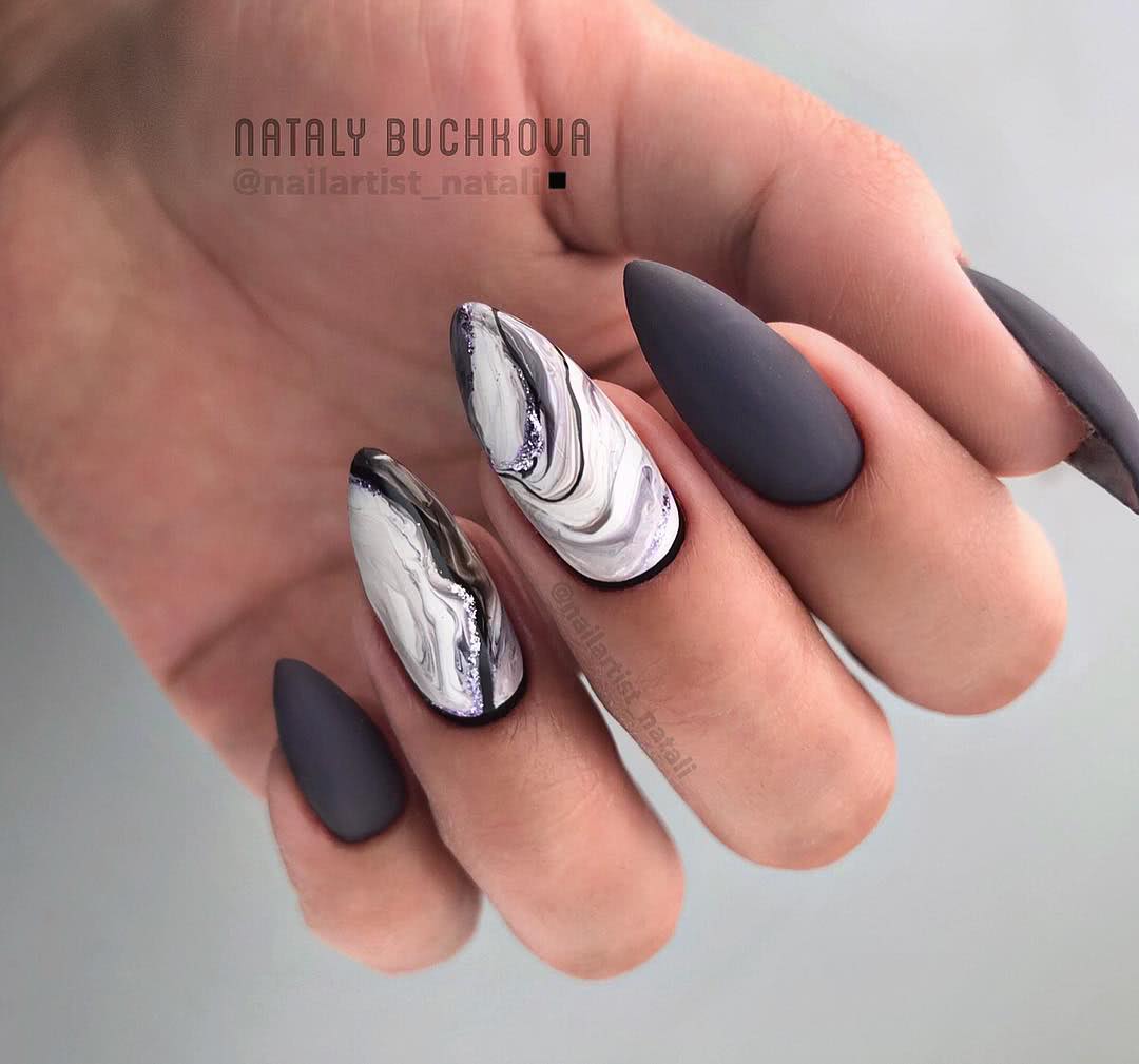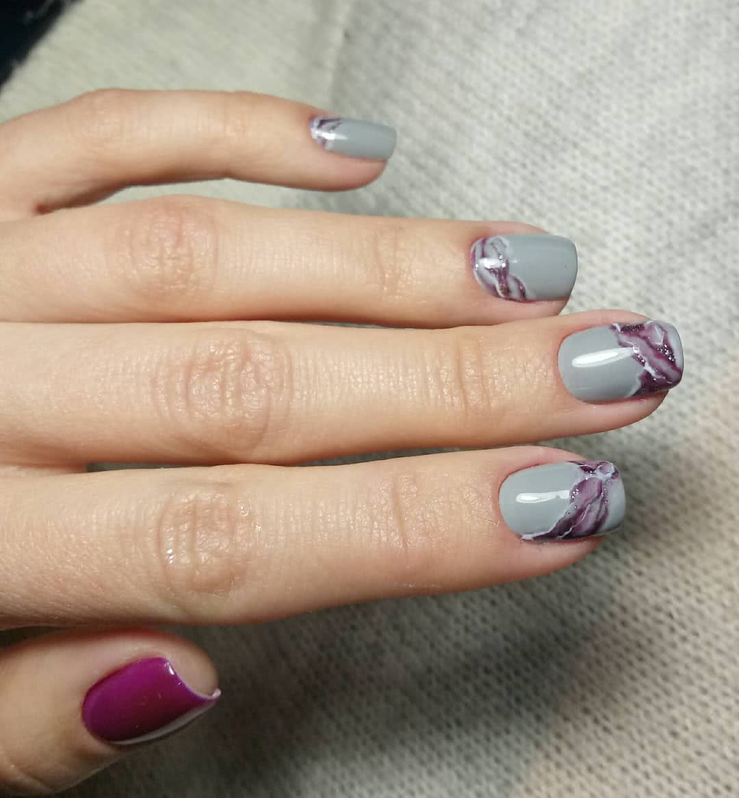 Этот способ создает самый «мраморный» эффект. Он не занимает много времени и выглядит просто неповторимо. Именно методом рисования узор на ногте становится максимально приближенным к узору на настоящем камне.