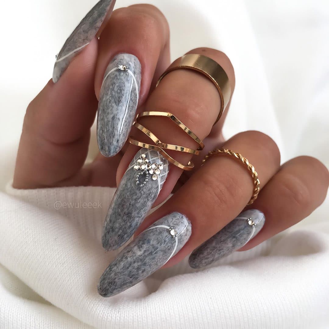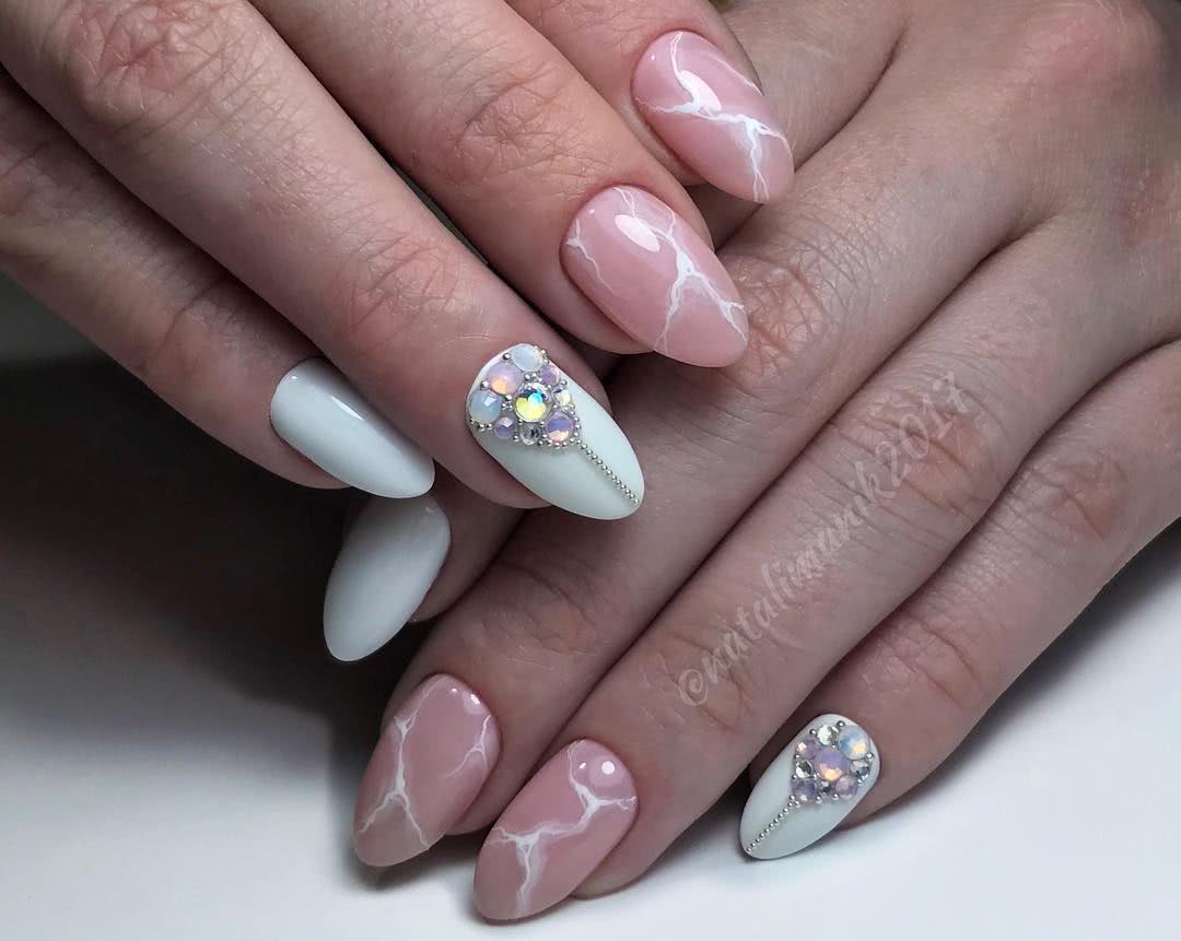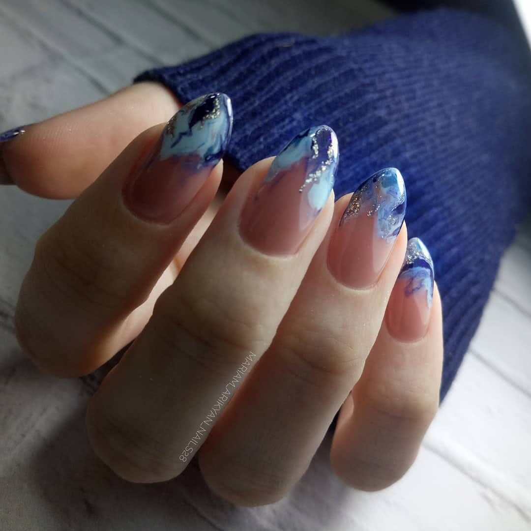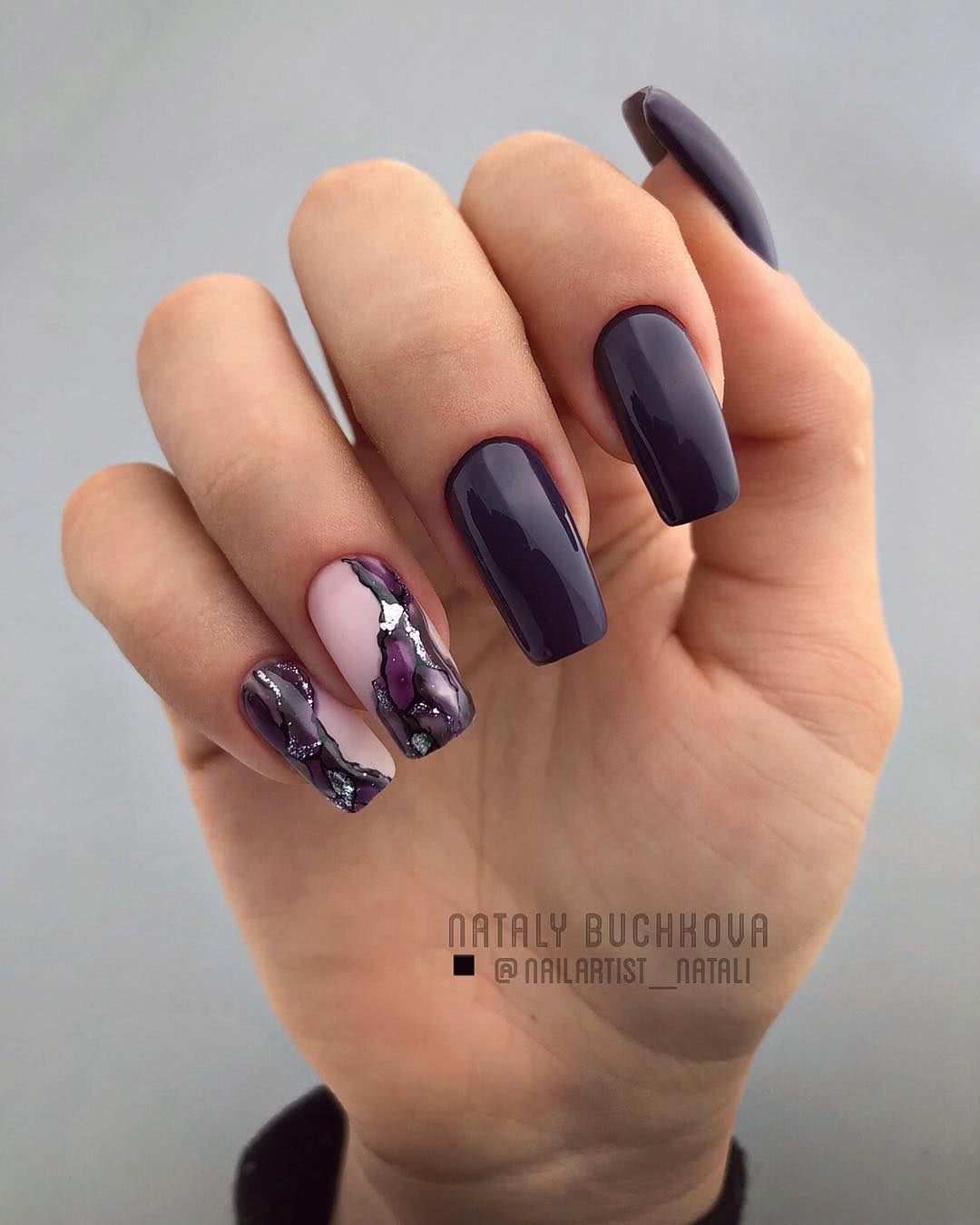 Этот способ создает самый «мраморный» эффект. Он не занимает много времени и выглядит просто неповторимо. Именно методом рисования узор на ногте становится максимально приближенным к узору на настоящем камне.