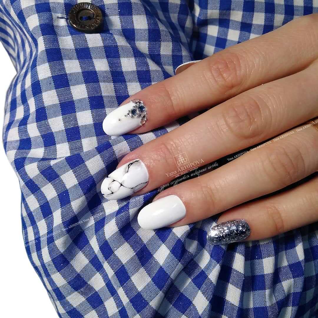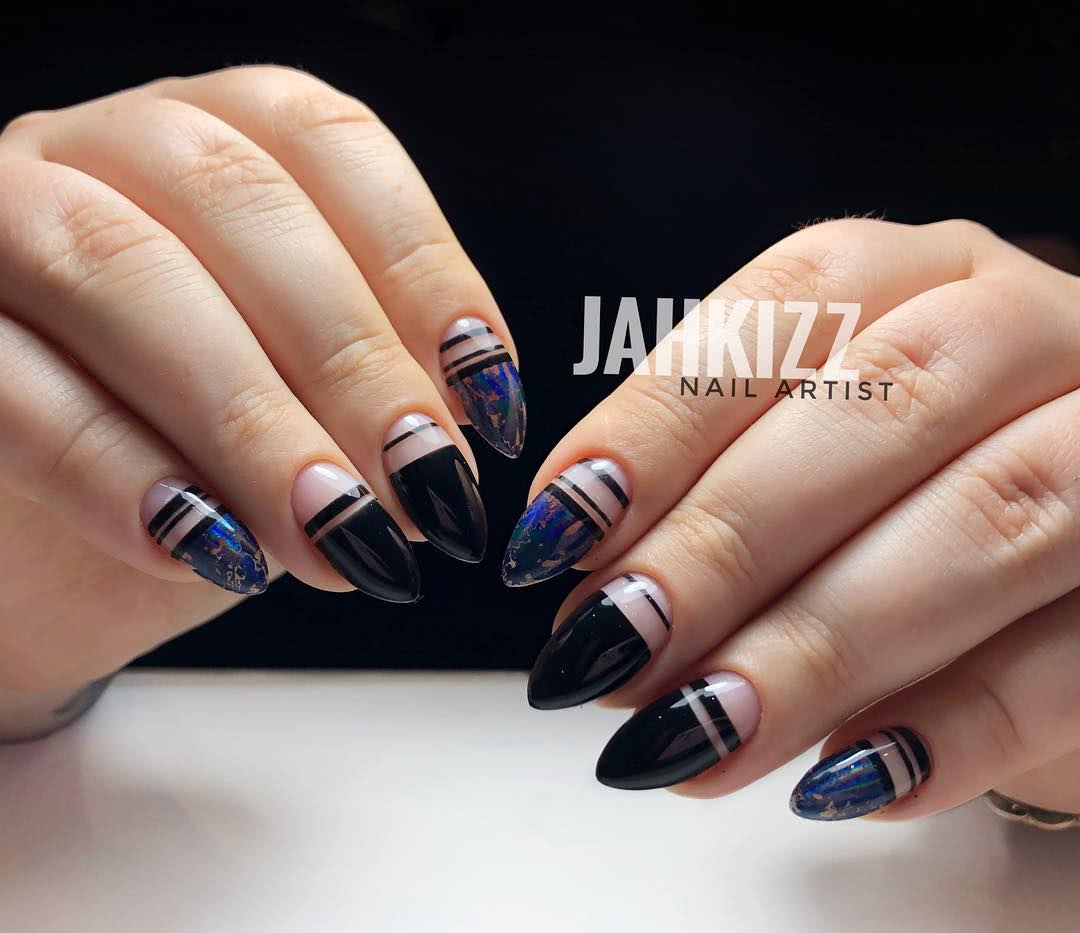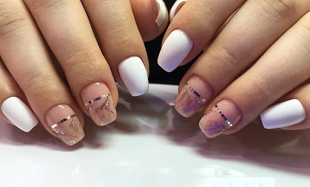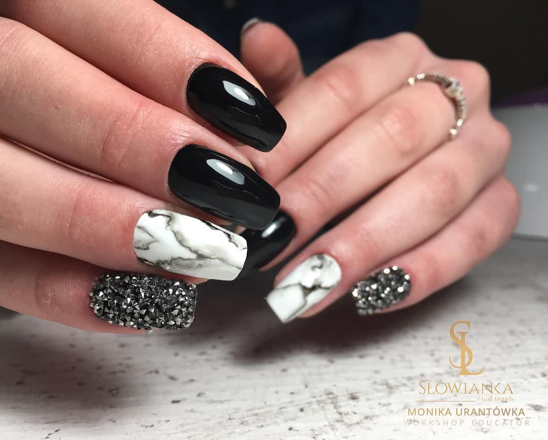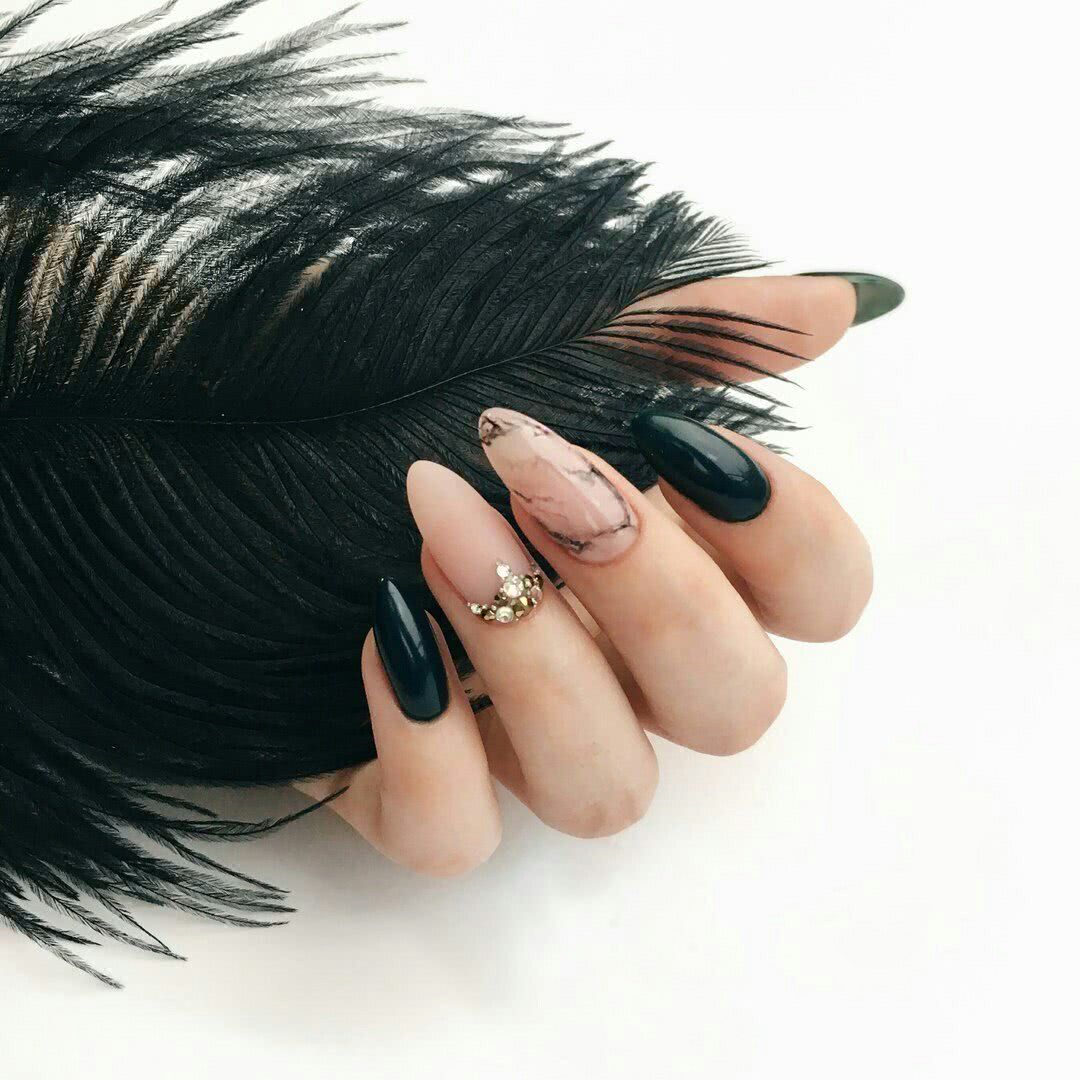 Выбирайте лаки пастельных тонов для основного фона и вы визуально увеличите пластину ногтя. Но если вы хотите подчеркнуть идеальную форму своих коротких ногтей, или вас ждёт вечерний выход, чёрной жемчужиной на ваших аккуратных ногтях засияет чёрный маникюр с мраморным эффектом. Белые прожилки будут сверкать, как молнии на чёрном небе, а верхний слой глянцевого топа будет отражать свет ярких огней.