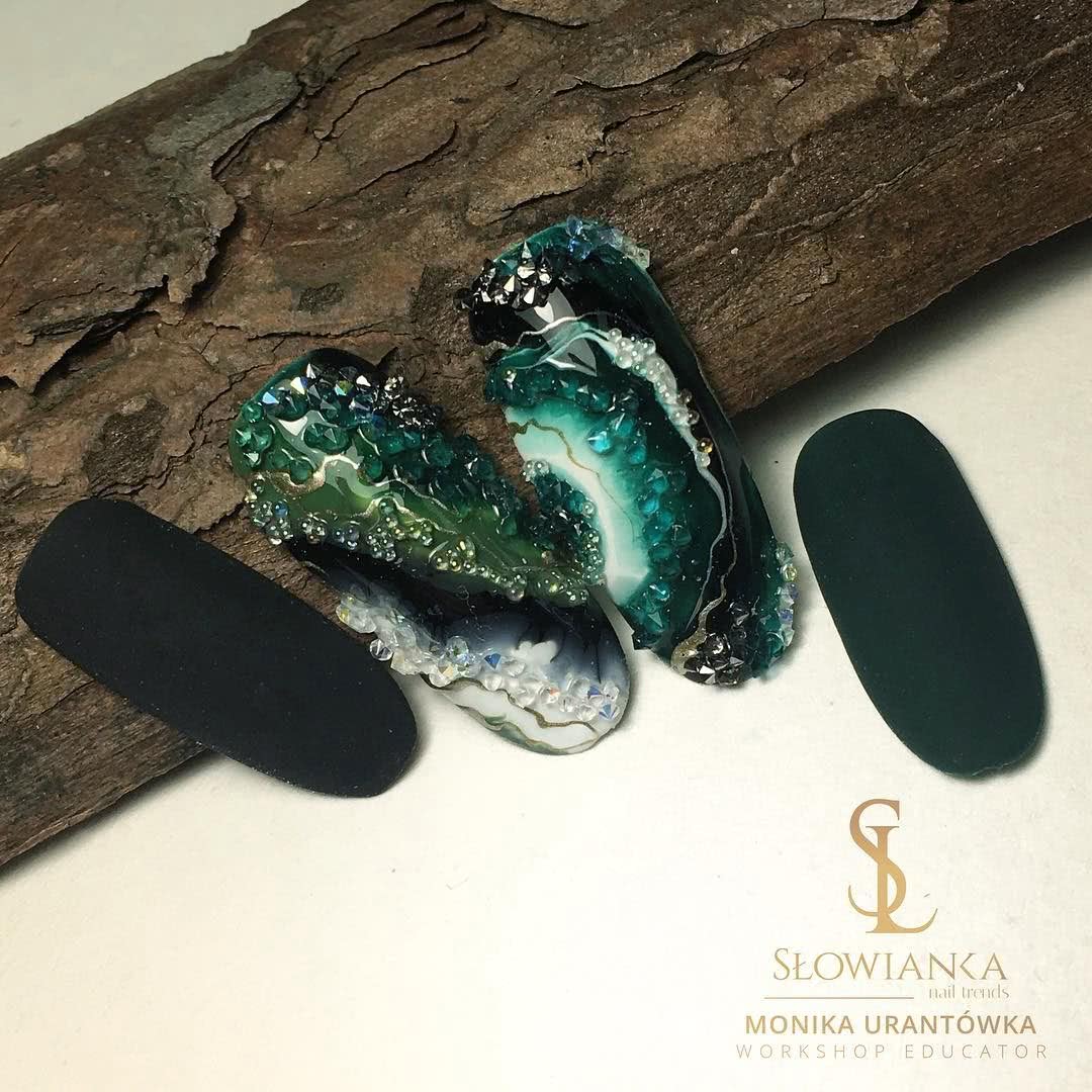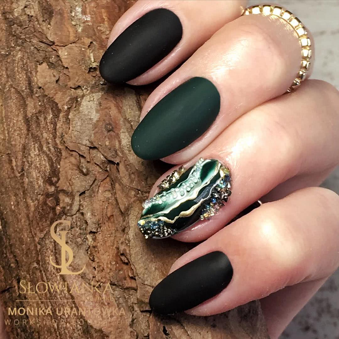 С помощью воды можно получить интересную каменную структуру, причем очень простую и легкую в исполнении. Рассмотрим, как сделать мраморный маникюр в стиле бирюзы, используя эту технику. Нам понадобится: емкость с водой, зубочистка, три цвета лака (черный, золотой и бирюзовый оттенки) и финиш. Лак быстро сохнет, поэтому откройте флаконы заранее и действуйте быстро. Итак, приступим: