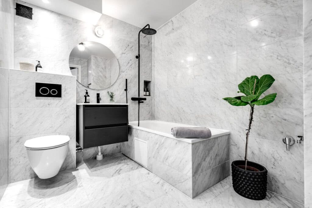 Дизайн ванной комнаты: плитка под мрамор белая и черная